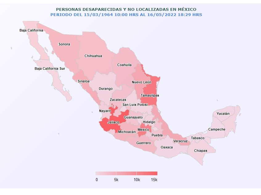 Los estados con mayor número de desapariciones son Jalisco (14.951), Tamaulipas (11.970), Estado de México (10.993), Nuevo León (6.218) y Veracruz (5.737).